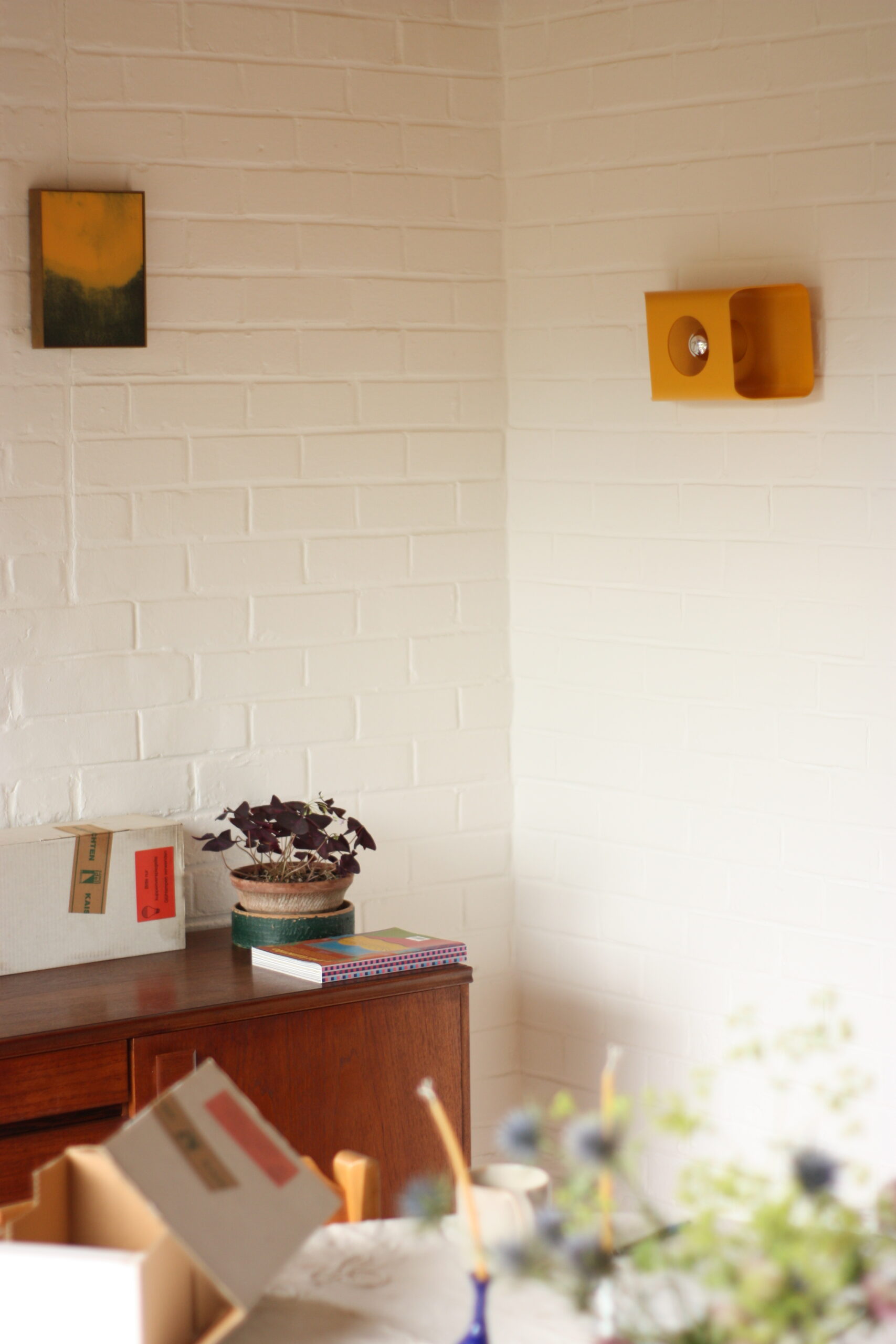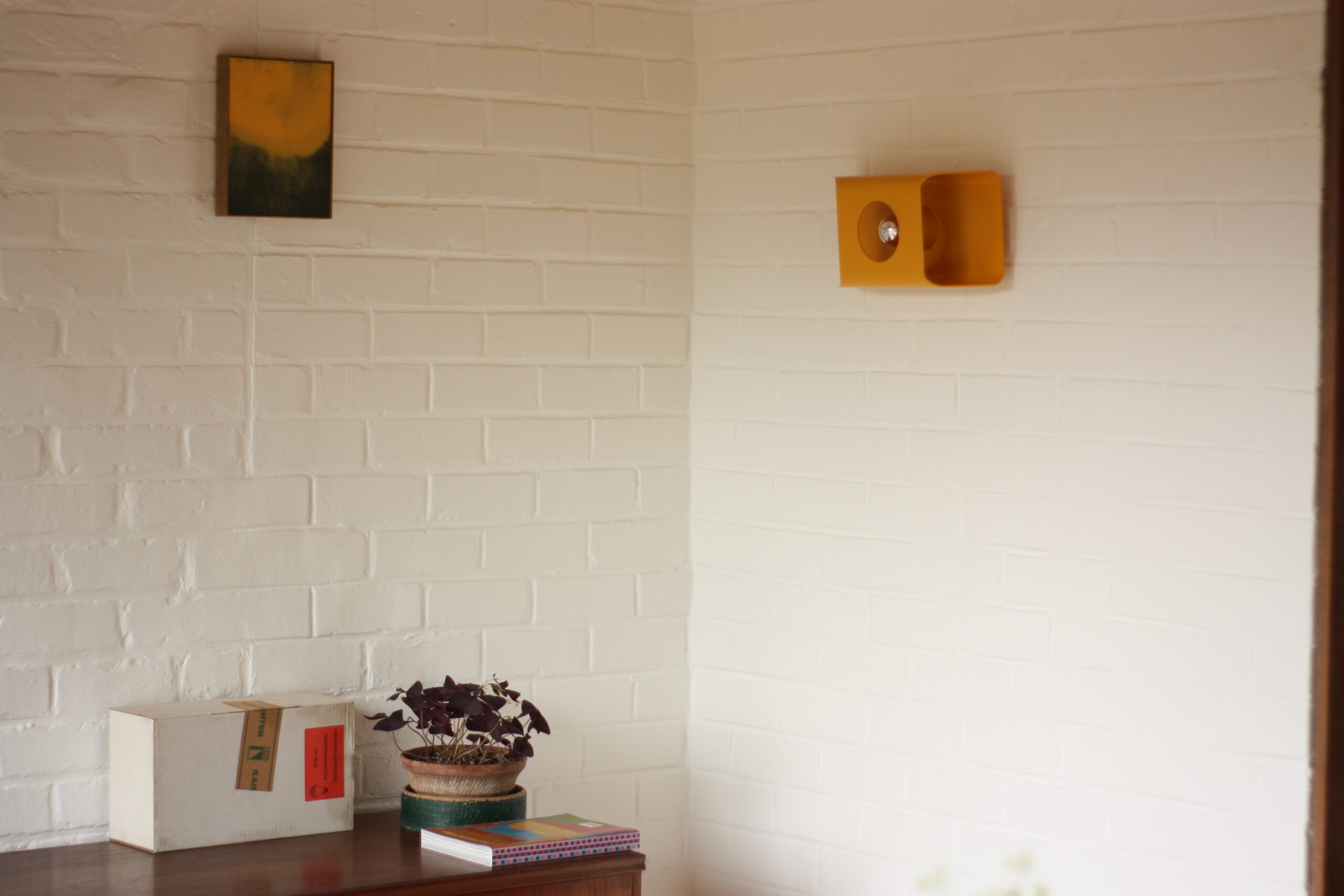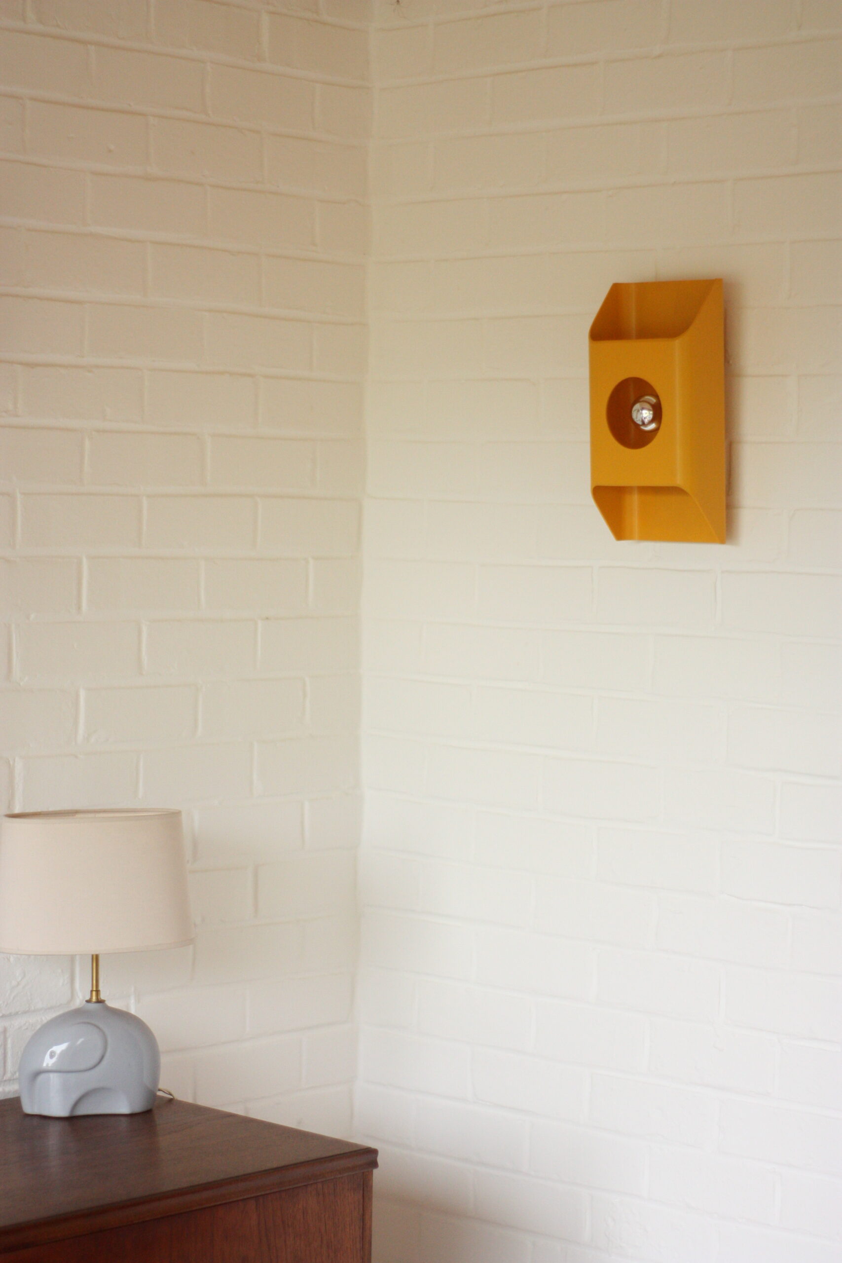 Leur design audacieux séduit autant allumées qu’éteintes : un corps rectangulaire aux courbes douces, épais et solide, percé d’une ouverture circulaire qui révèle l’ampoule. La lumière se diffuse vers le haut et le bas, créant un effet lumineux à la fois doux et graphique. Montées sur un socle qui les détache élégamment du mur, ces lampes peuvent être installées verticalement ou horizontalement selon l’effet recherché.