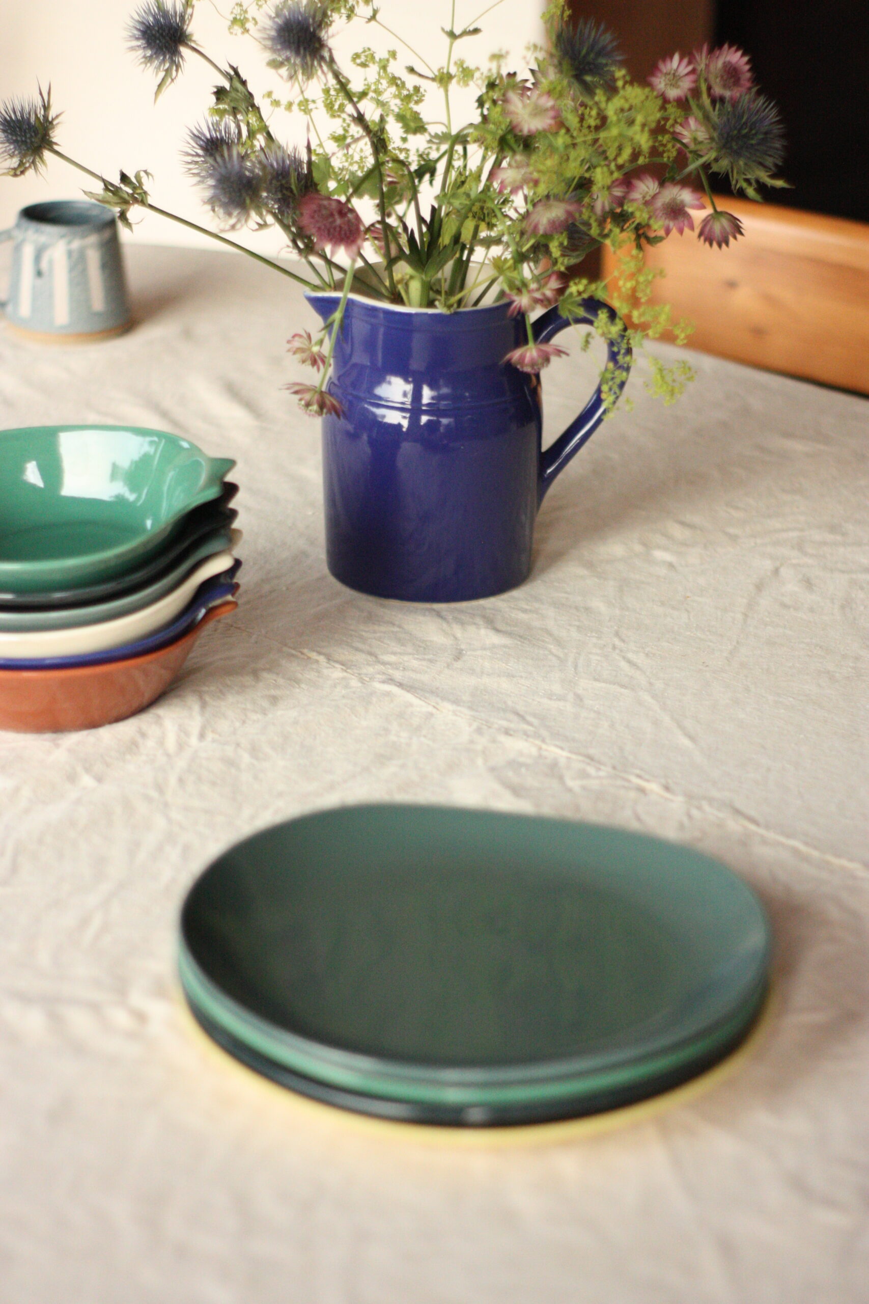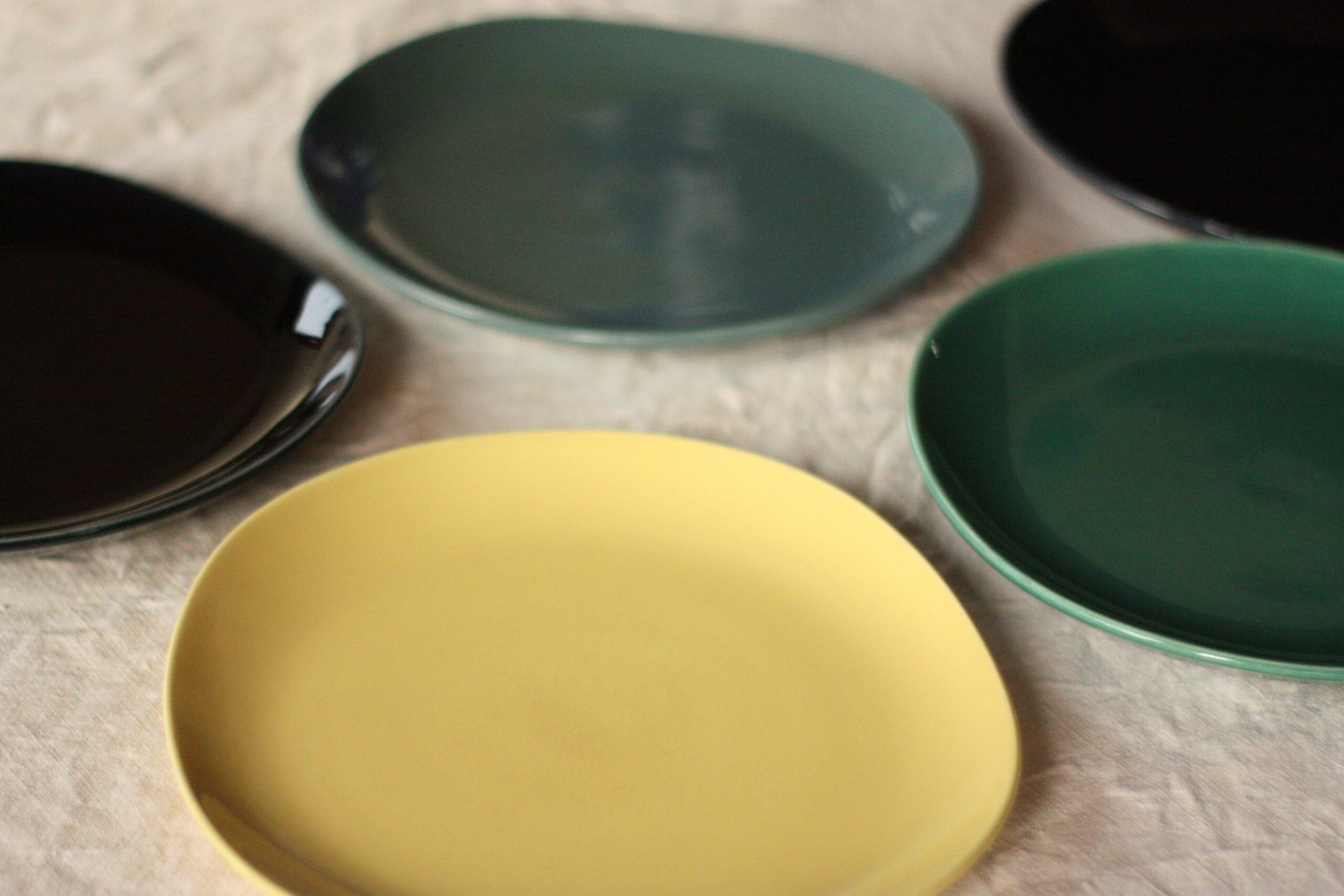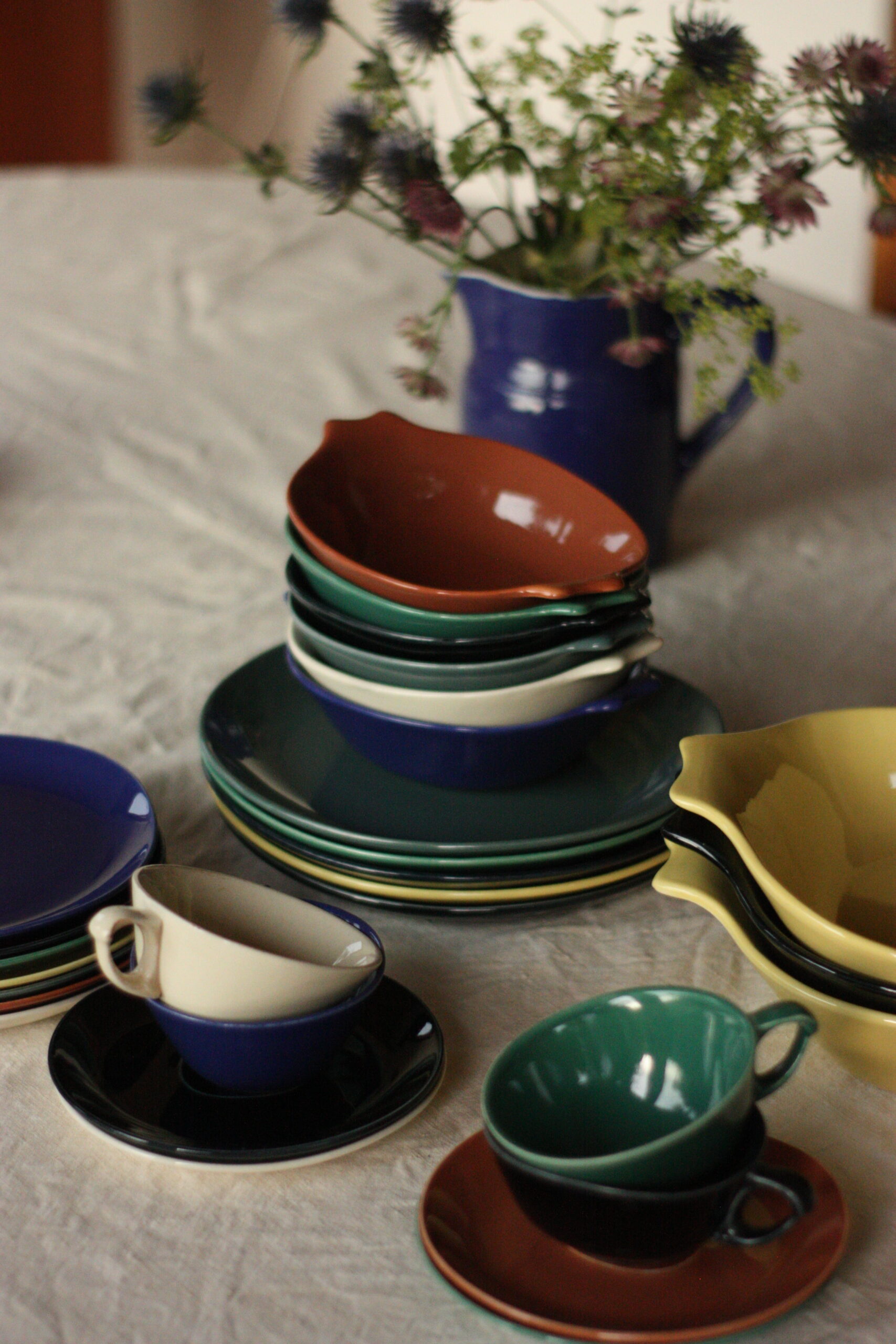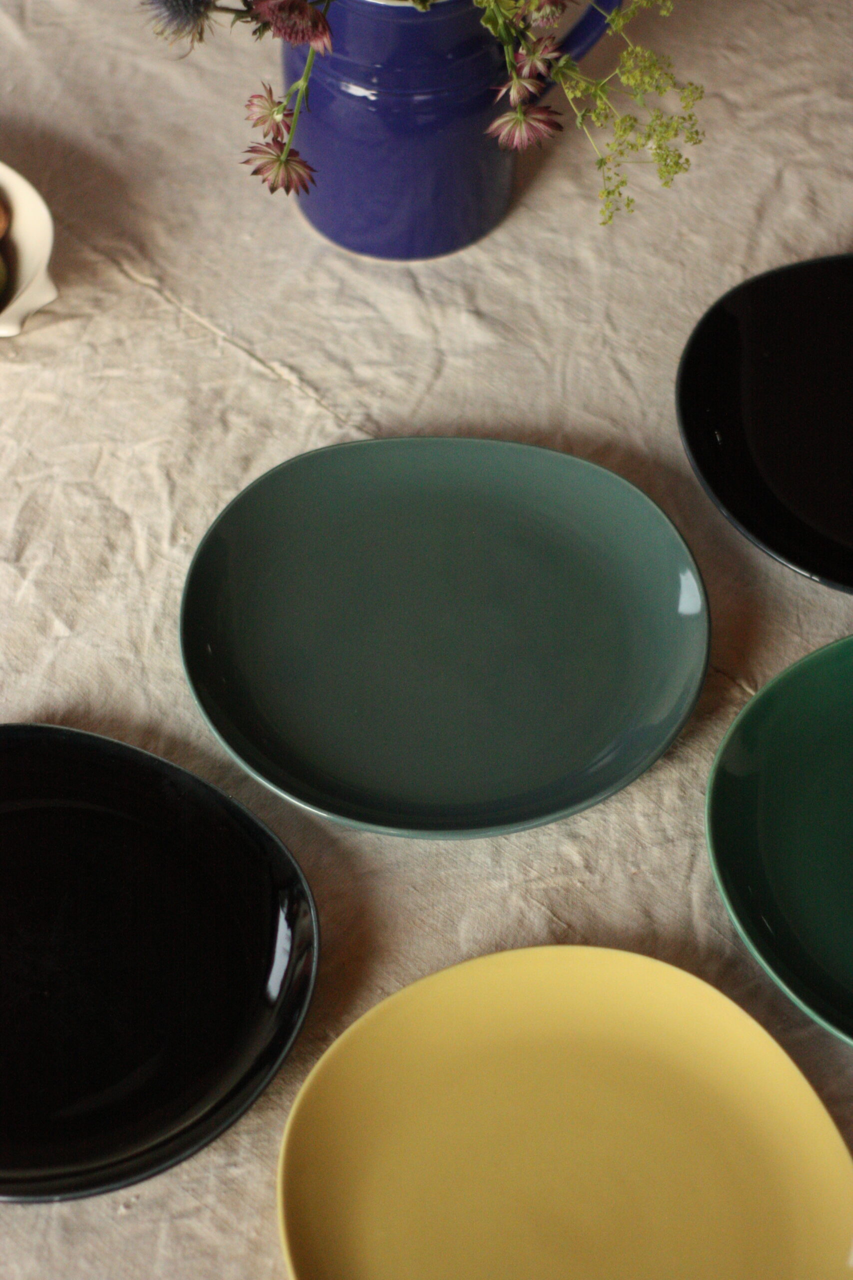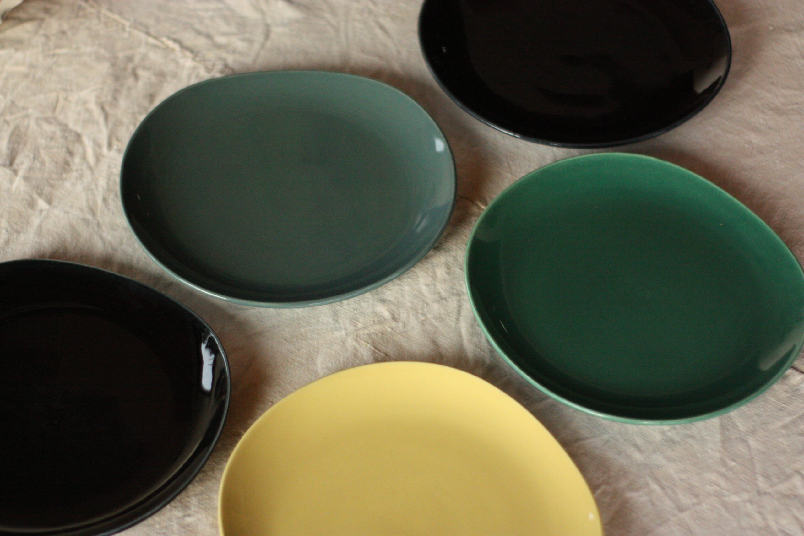 Je vous propose ici un set de cinq assiettes à dîner. Seul l’assiette noir présente quelque griffures légères. Je partage également sur le site d’autres pièces de ce service unique, que vous pouvez composer à votre guise. N’hésitez pas à me contacter si vous souhaitez vous procurer le service complet.