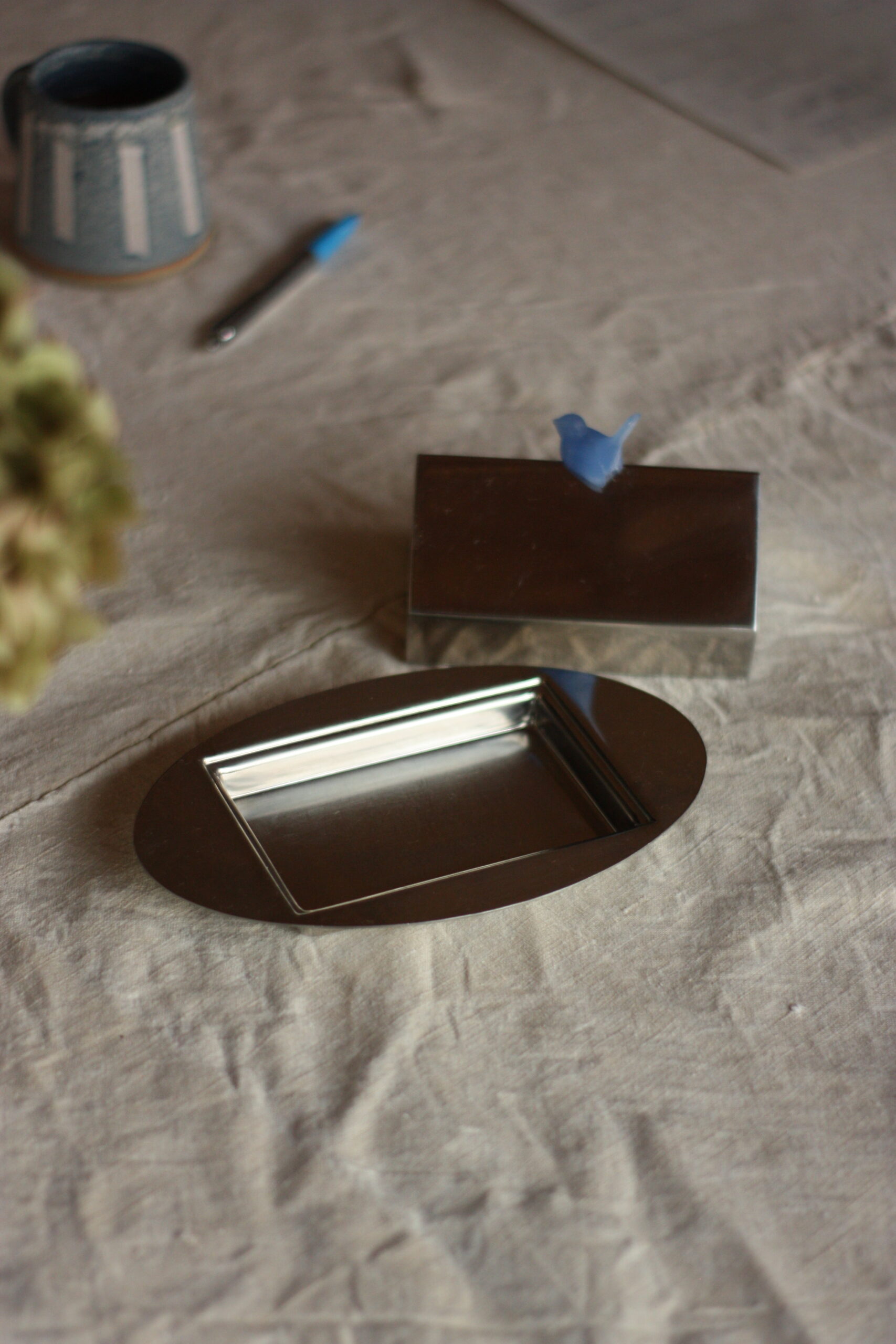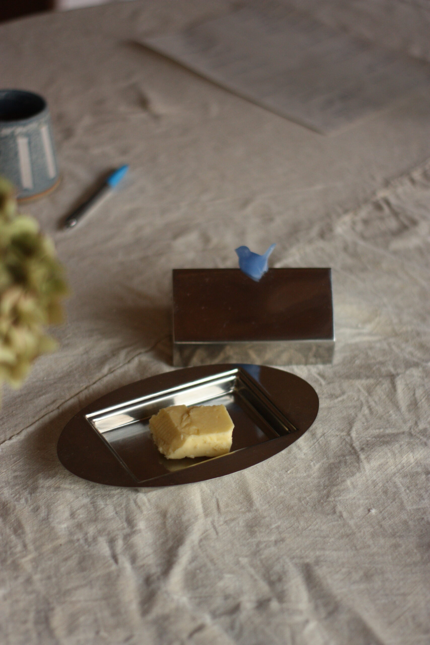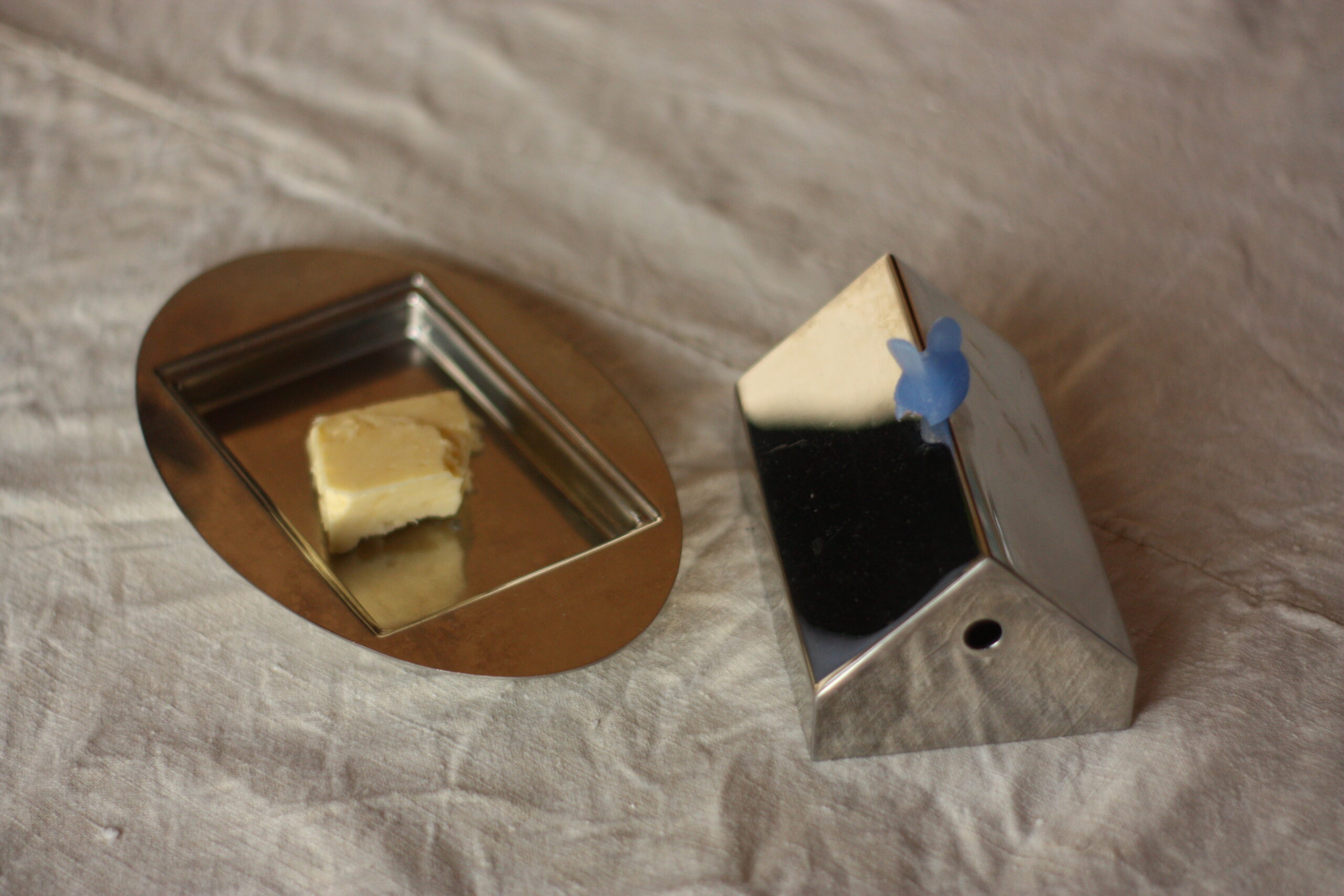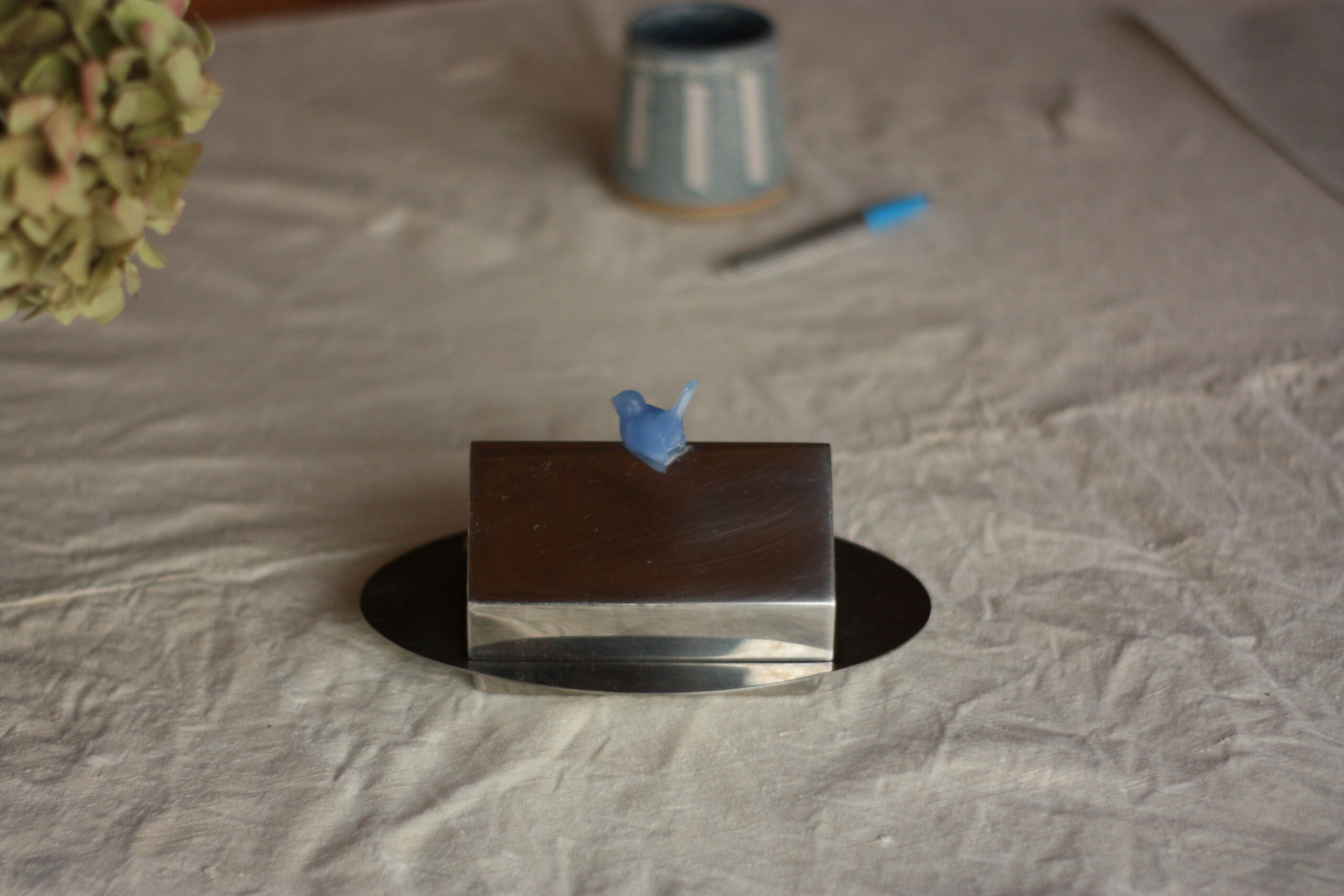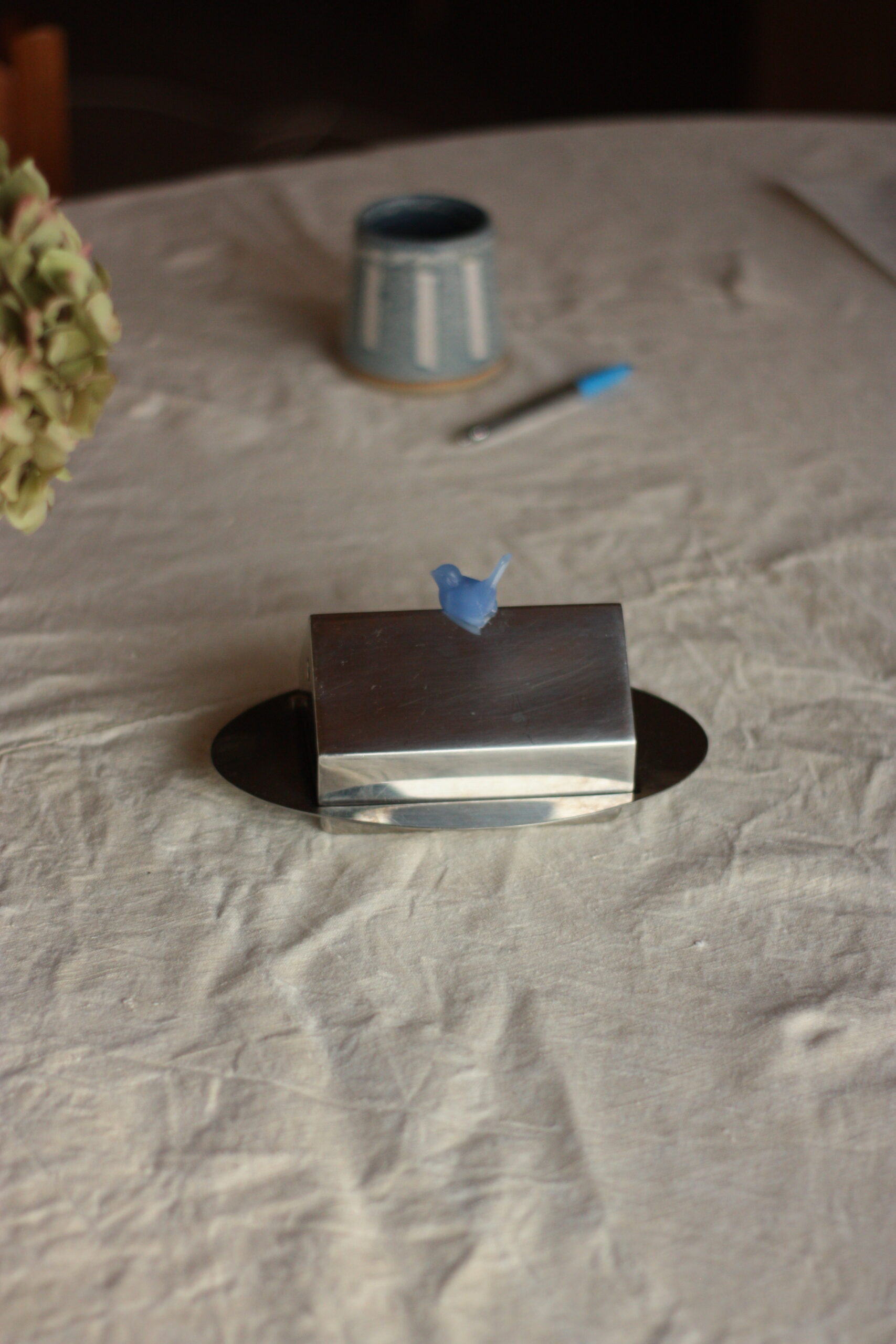 Ce beurrier en aluminium, un matériau tendance représente une petite maison avec posé sur son toit un petit oiseau bleu qui vient lui apporter une touche poétique pour la table du petit-déjeuner.