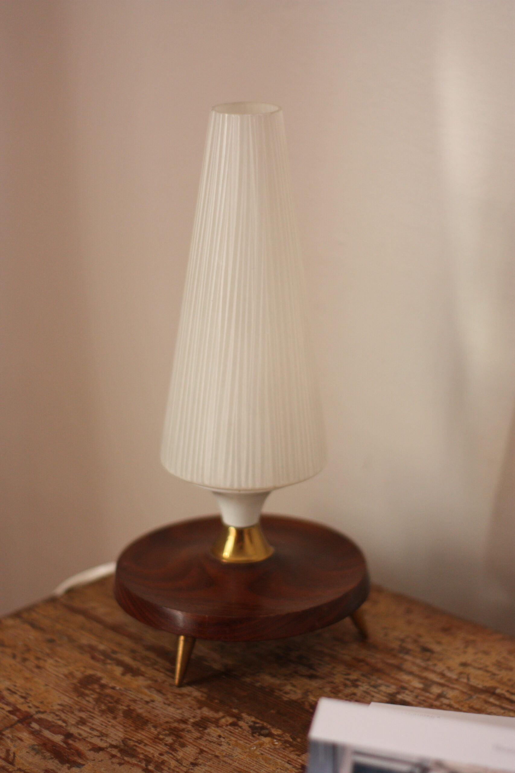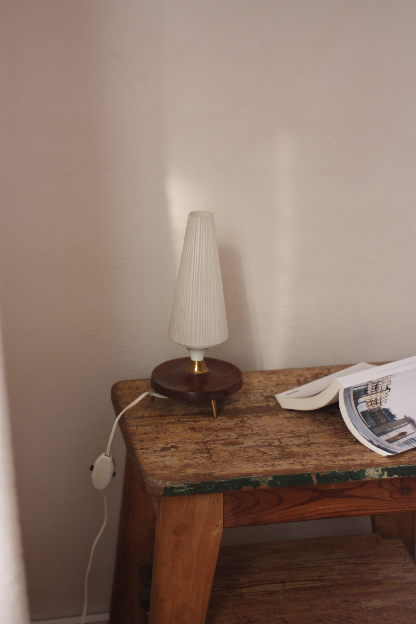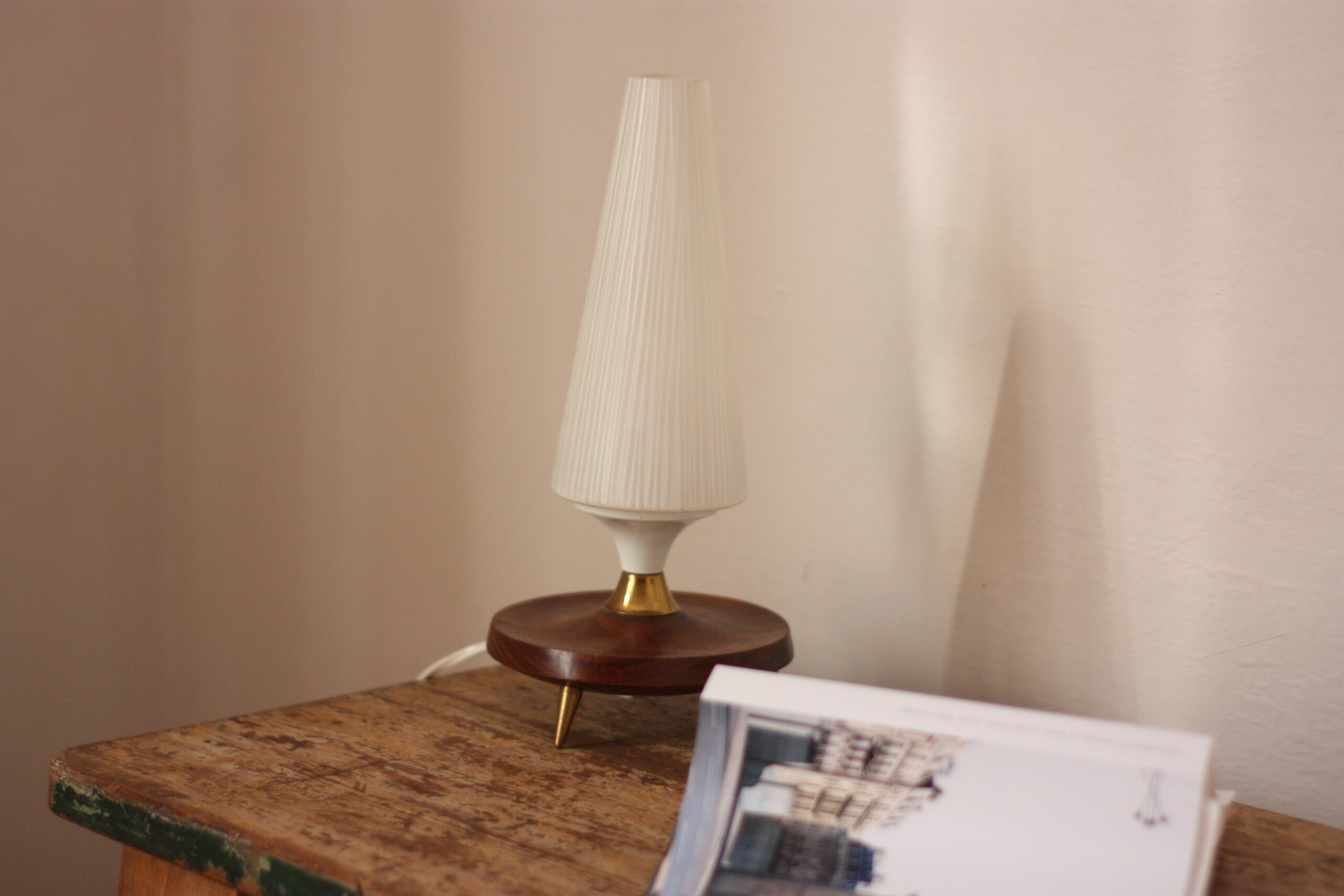 Son abat-jour en opaline, au léger relief de lignes, repose sur un socle en bois, tandis que ses petits pieds délicats sont en laiton.
