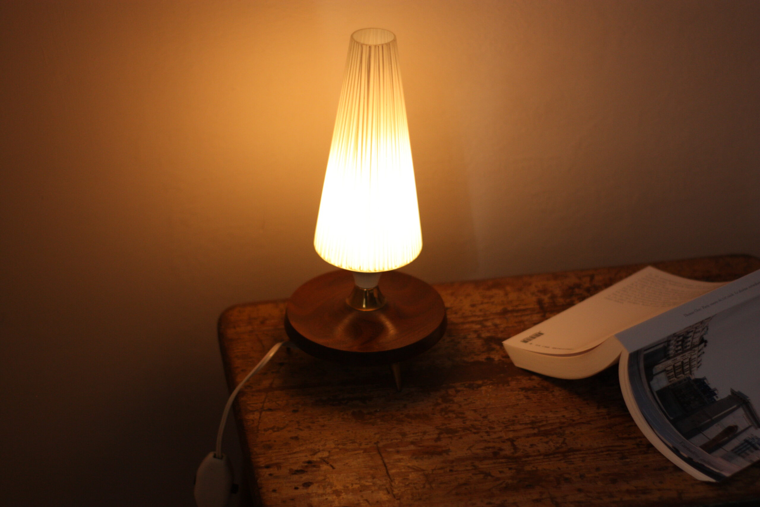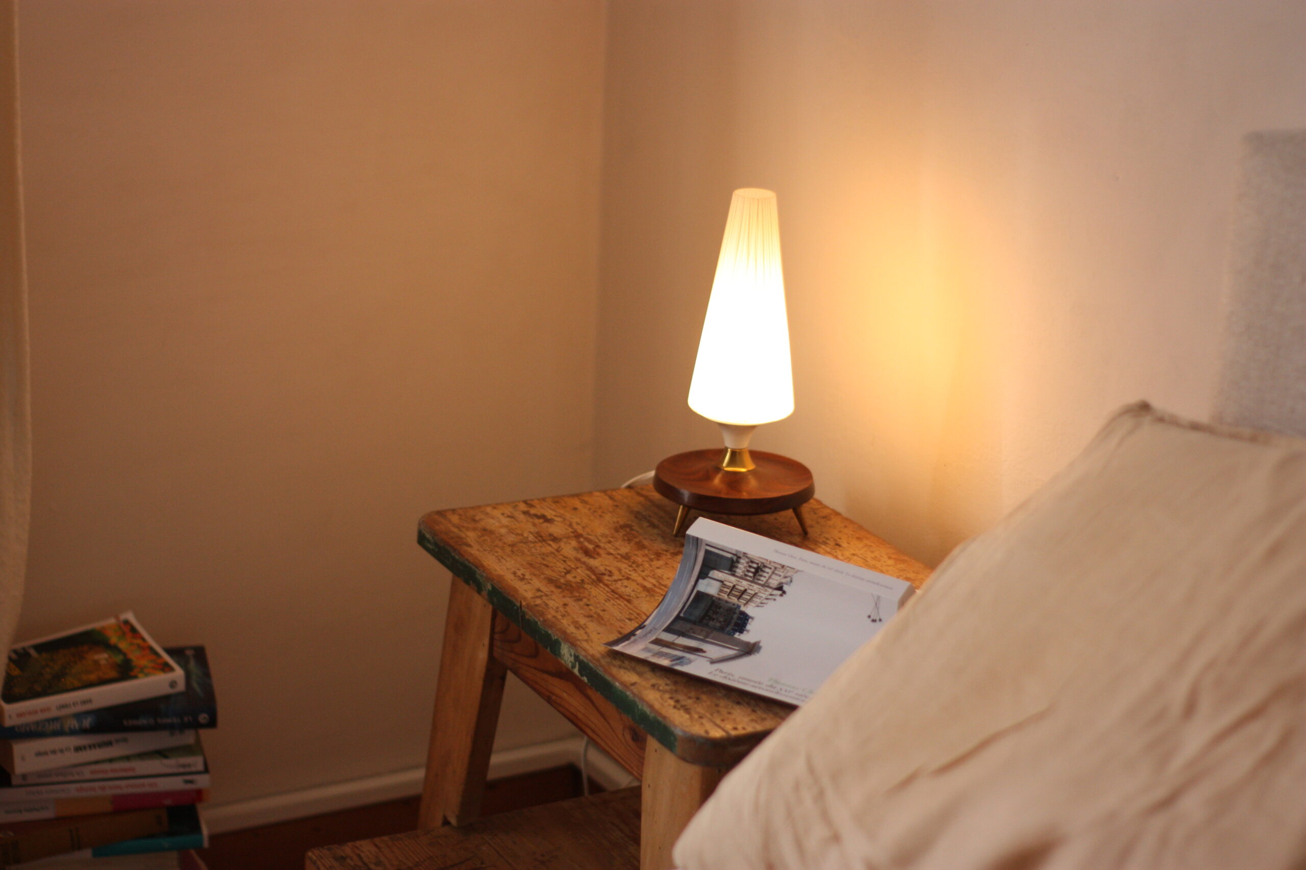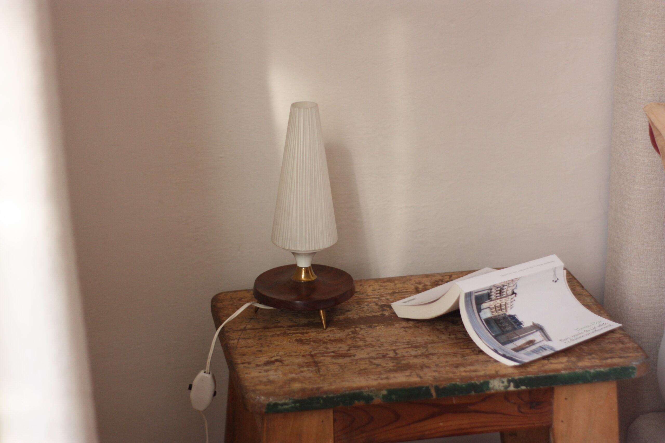 Son abat-jour en opaline, au léger relief de lignes, repose sur un socle en bois, tandis que ses petits pieds délicats sont en laiton.