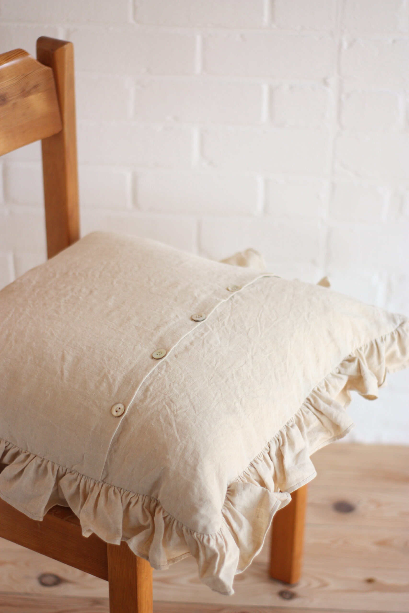 Louise Tresvaux du Fraval, styliste-designer passionnée qui vit et travaille aujourd’hui en Bretagne, nous propose ici un modèle de coussin froncé, imaginé et signé de ses mains de brodeuse. Il est garni de plumes de canard, se distingue par son dos orné de boutons de nacre et son tissu 100 % lin, à la fois noble et intemporel.