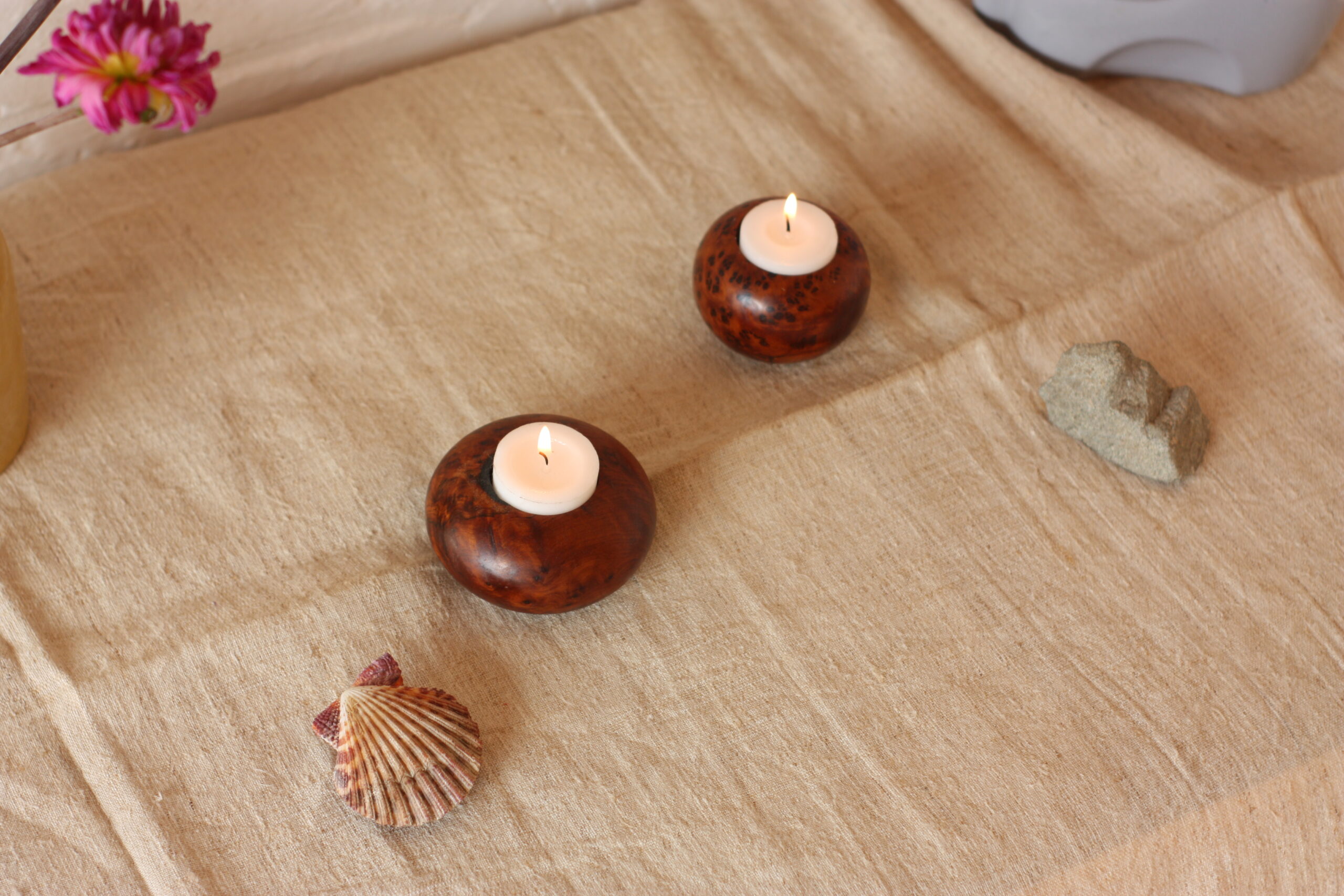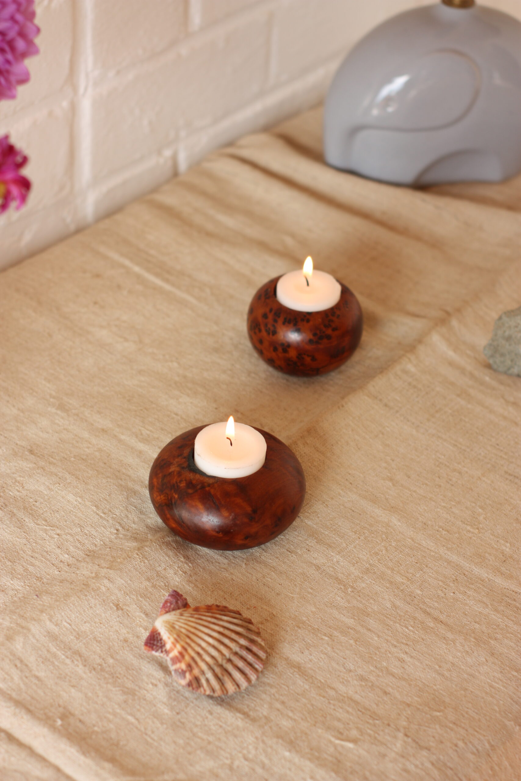 Bougeoirs en bois de noyer à disposer sur vos tables ou commodes pour installer chez vous la tranquillité en allumant leur bougies.
