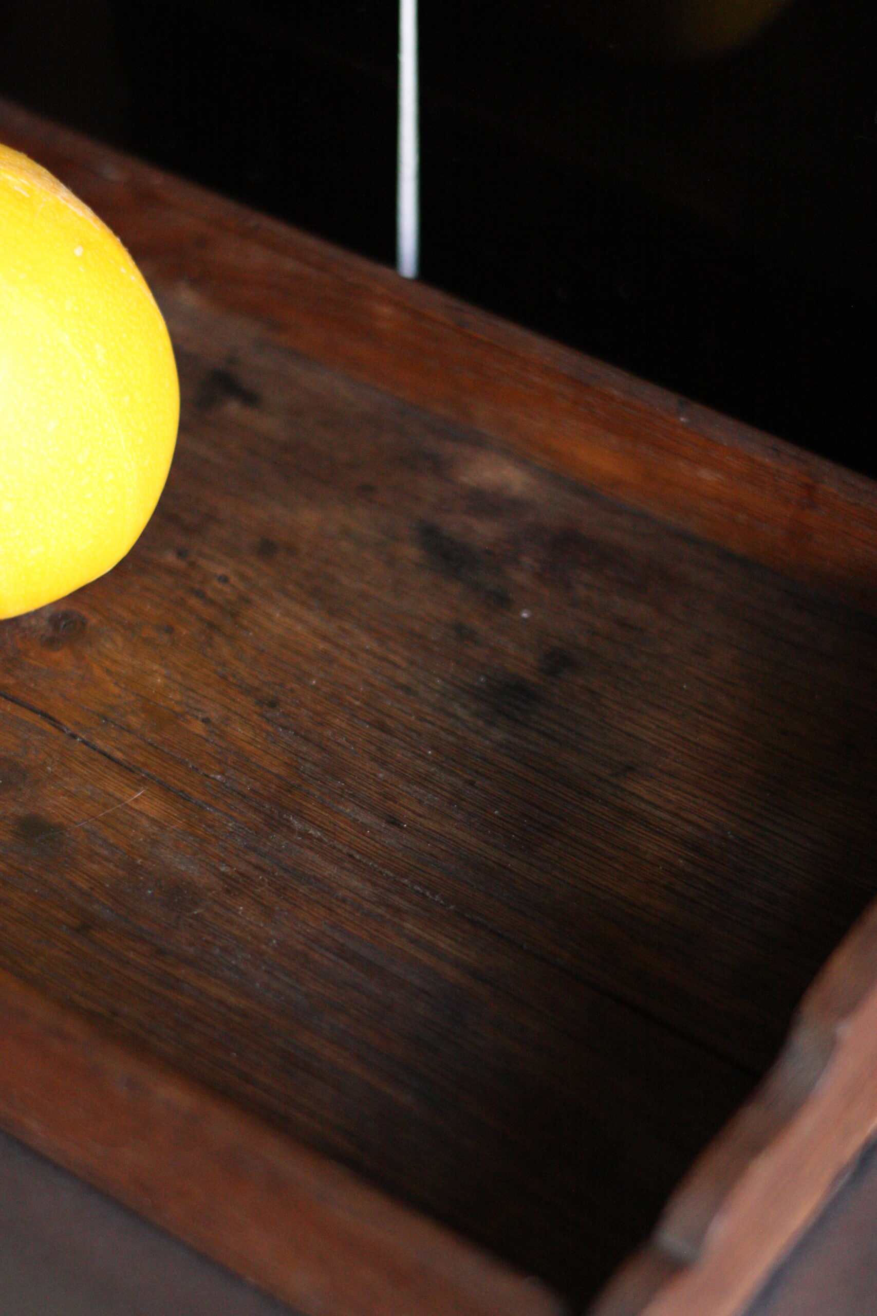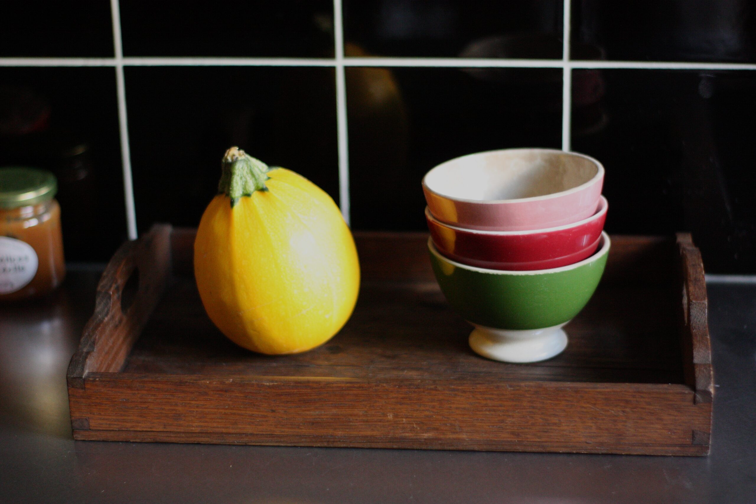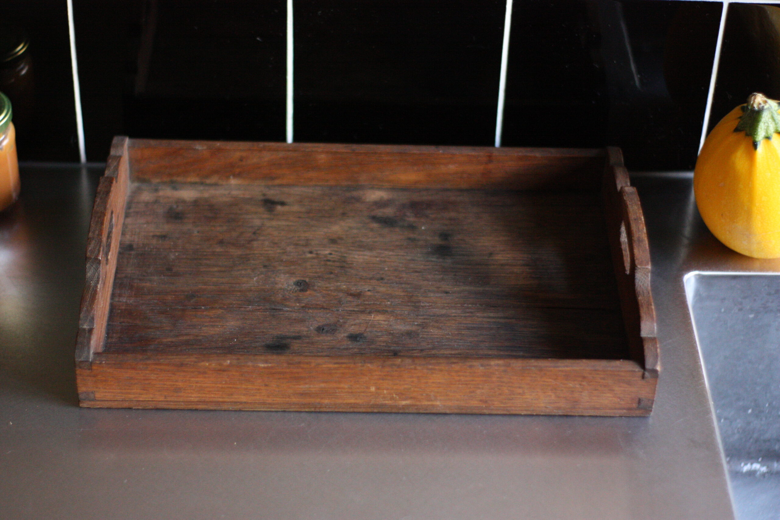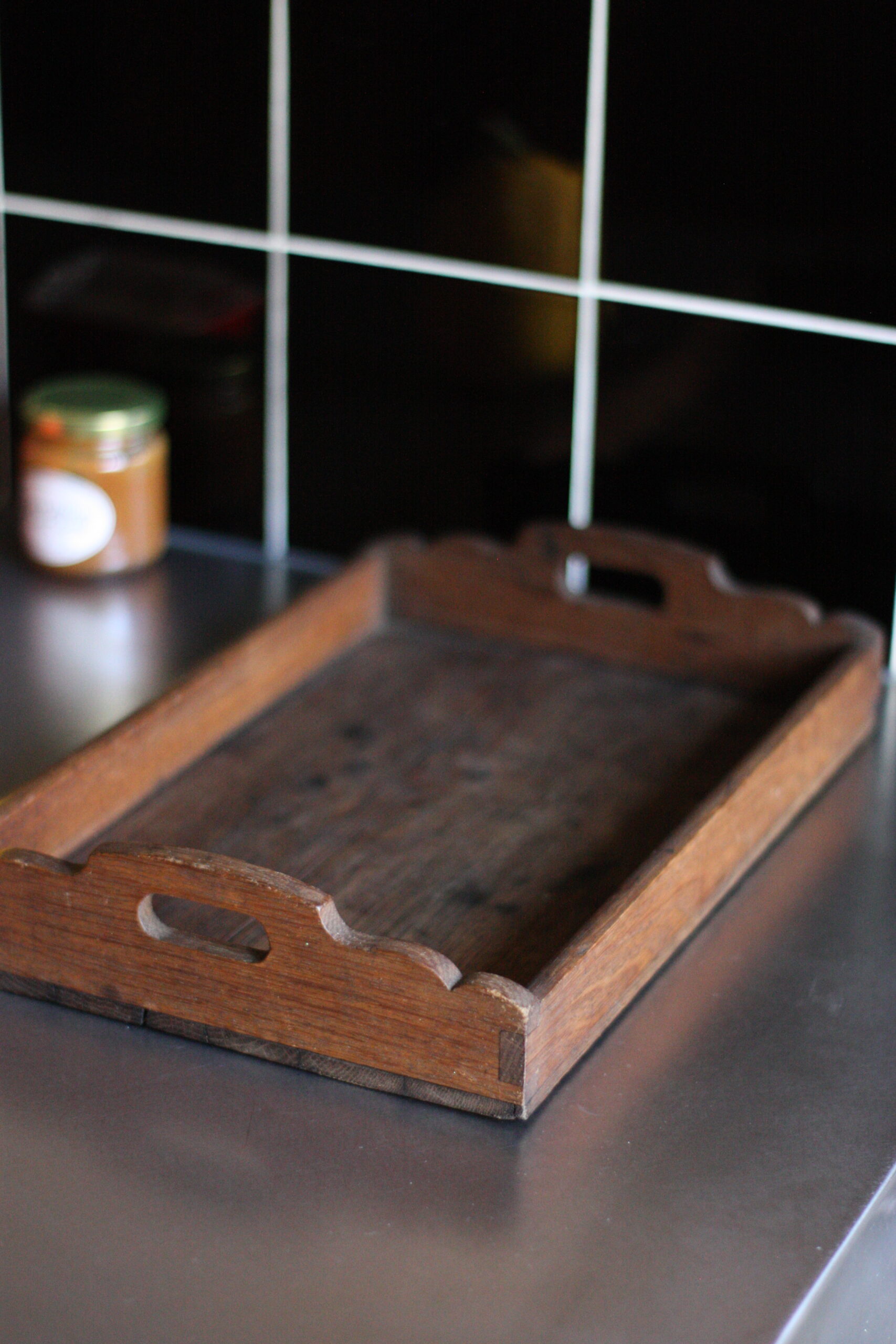 Ce plateau en bois de chêne foncé est très décoratif, il se suffit d’ailleurs à lui-même.
