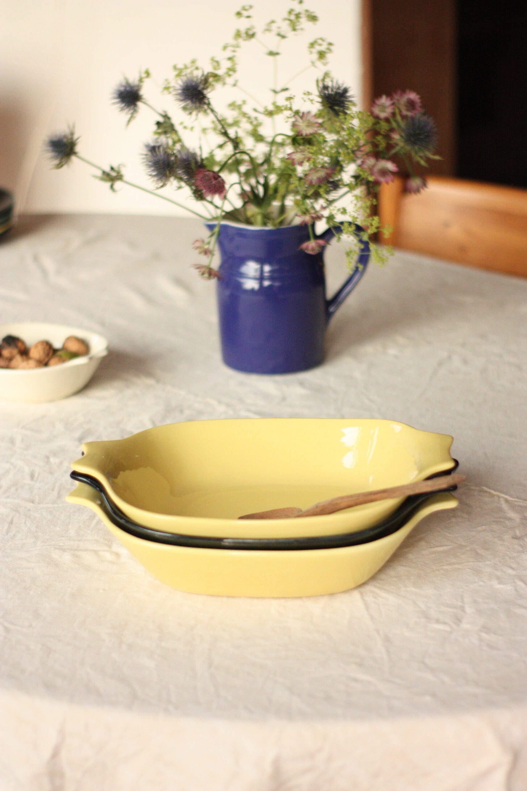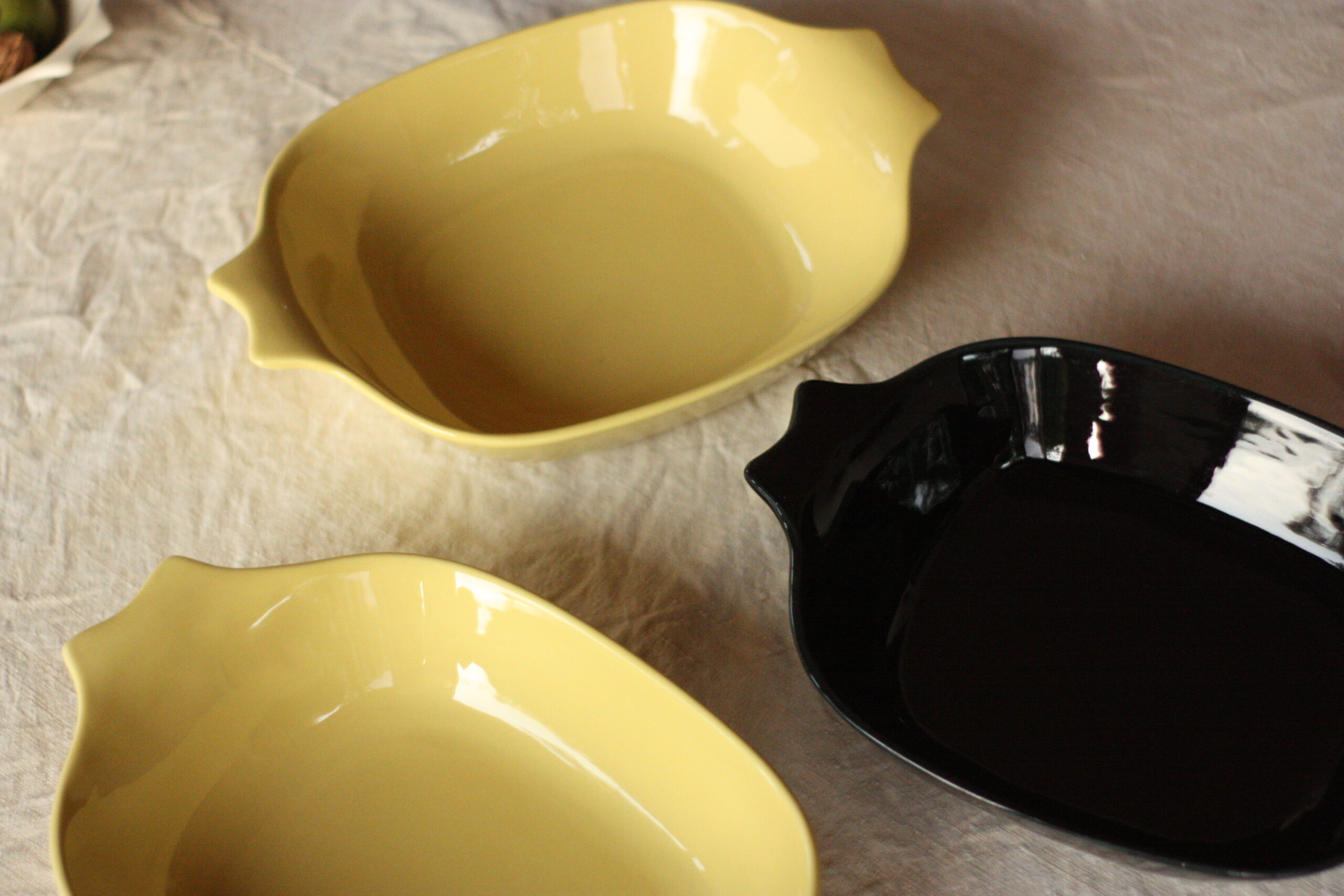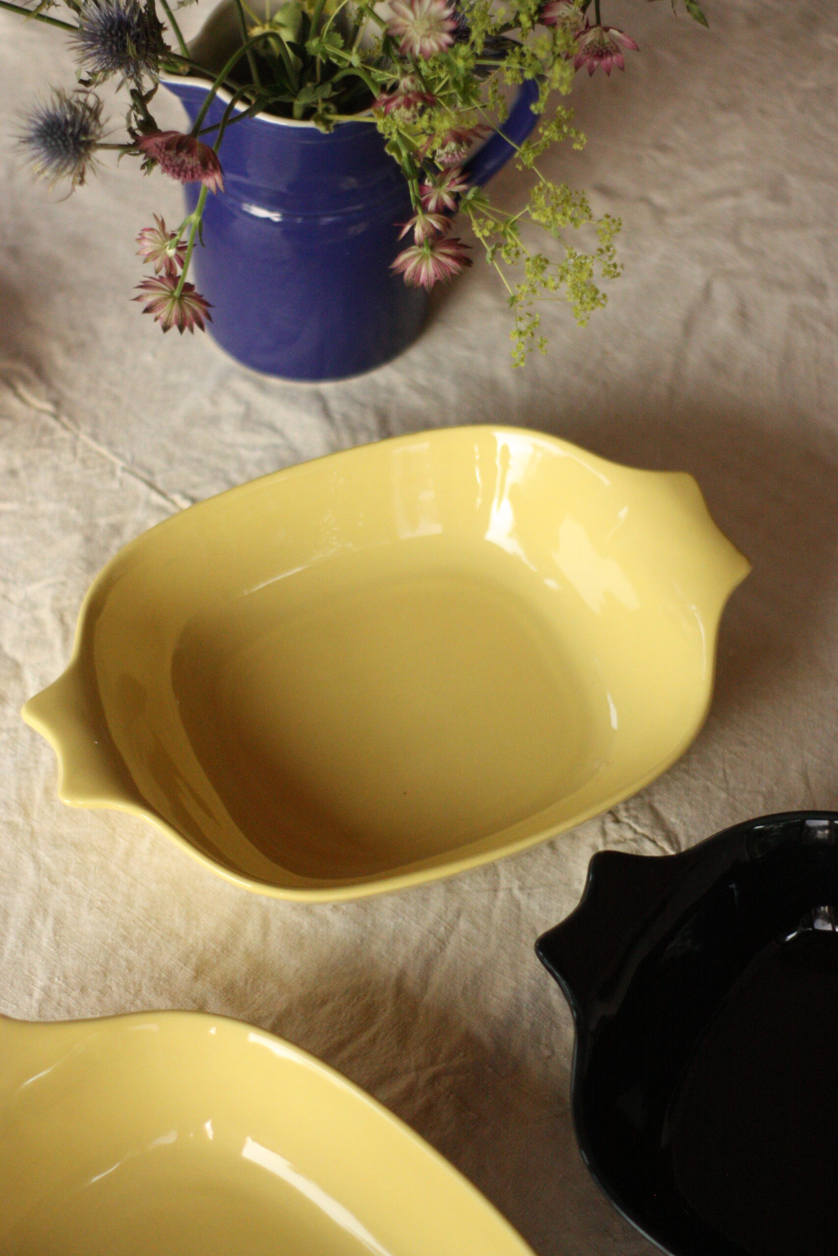 Je vous propose ici trois saladiers qui s’achète à la pièce. Deux jaunes et un noir qui ne présentent aucun coup. Je présente également sur le site d’autres pièces de ce service unique, que vous pouvez composer à votre guise. N’hésitez pas à me contacter si vous souhaitez vous procurer le service complet.