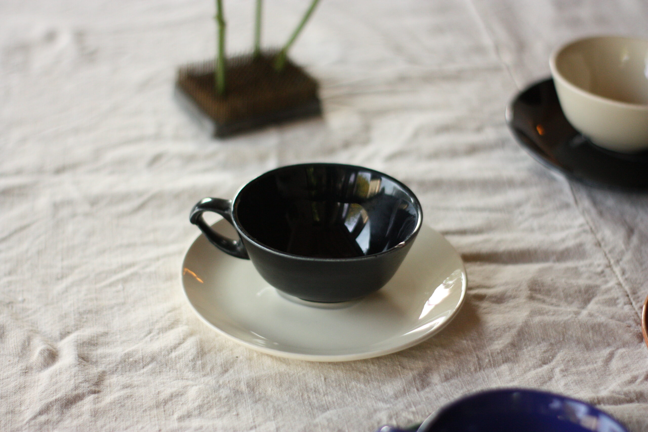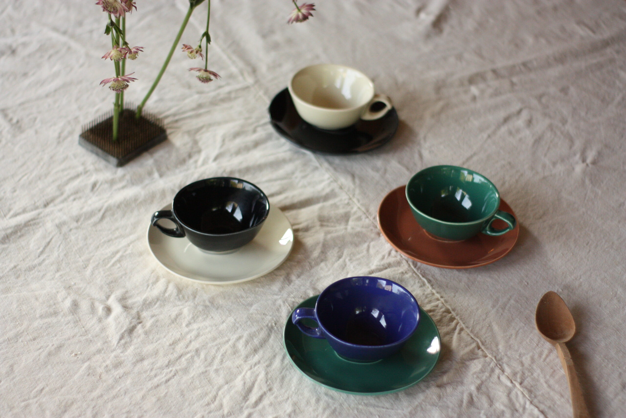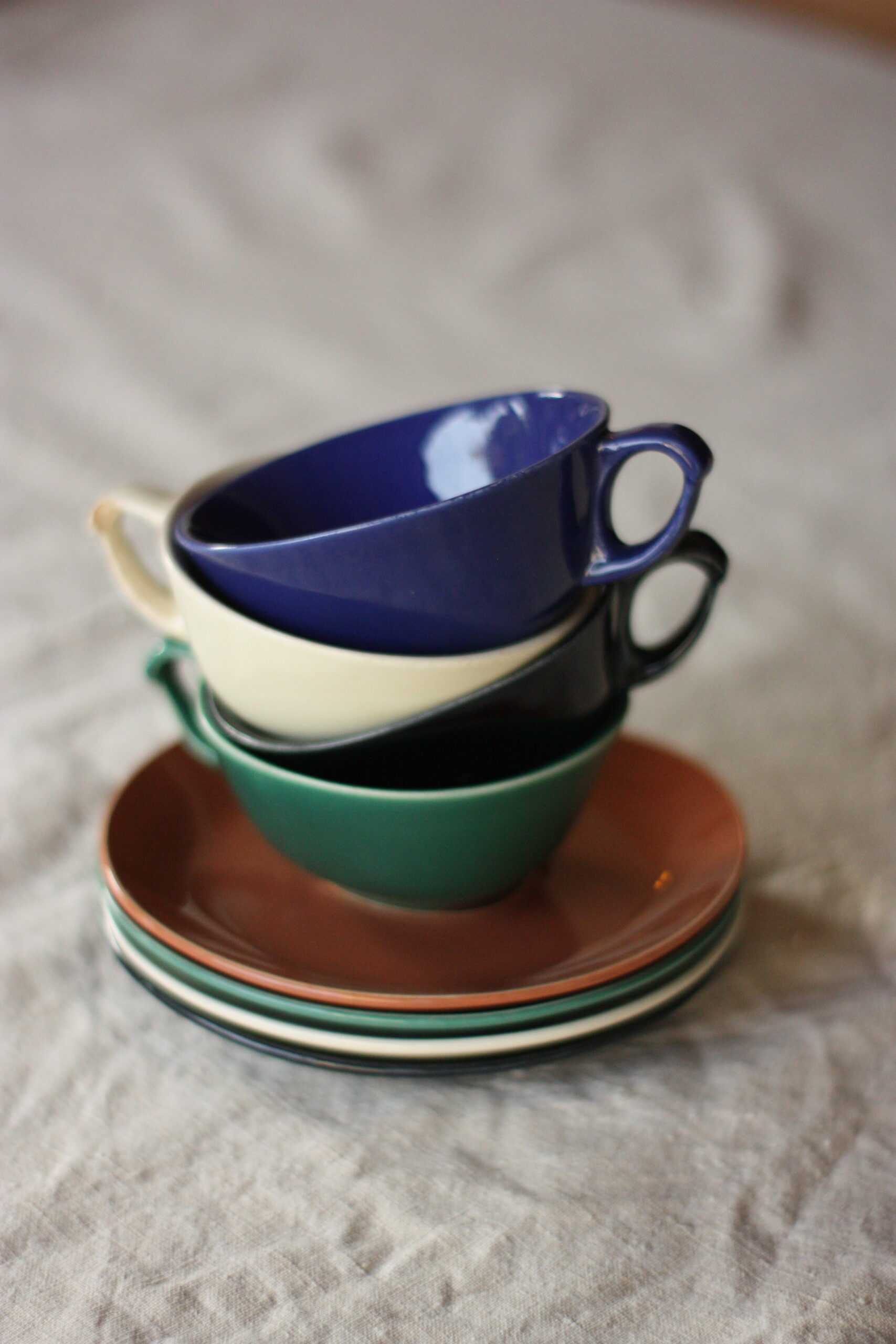 Je vous propose ici un set de quatre tasses à café ; seule la tasse noire présente un léger éclat. Je présente également sur le site d’autres pièces de ce service unique, que vous pouvez composer à votre guise. N’hésitez pas à me contacter si vous souhaitez vous procurer le service complet.